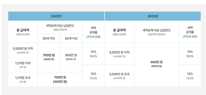 세액공제 한도는 개인의 소득에 따라 달라집니다. 2022년과 2023년의 세액공제 한도를 비교해보면,
